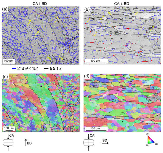 EBSD grain boundary misorientation maps superimposed with image quality (IQ) maps (a,b) and GROD-axis maps (c,d) for the LPBF-fabricated builds subjected to hot compression at 1000 °C/0.0013 s−1 up to a true strain of 0.8. CA and BD refer to compression axis and building direction, respectively. CA was either parallel (a,c) or perpendicular (b,d) to the BD. The blue and black lines mark low-angle grain boundaries with misorientations (θ), 2° ≤ θ < 15° and high-angle grain boundaries with θ ≥ 15°, respectively. Small red regions in (a,b) exhibit C14 Laves phase precipitate particles. The arrows in (a,b) indicate a few small, equiaxed grains formed at the pre-existing grain boundaries.