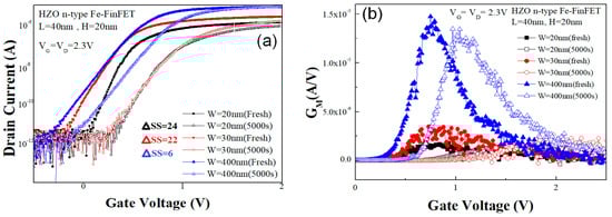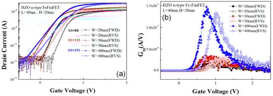 - Lin, C.L.; Hsiao, P.H.; Yeh, W.K.; Liu, H.W.; Yang, S.R.; Chen, Y.T.; Chen, K.M.; Liao, W.S. Effects of Fin Width on Device Performance and Reliability of Double-Gate n-Type FinFETs. IEEE Trans. Electron Devices 2013, 60, 3639–3644. [Google Scholar] [CrossRef]