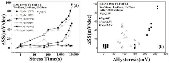 - Yang, Y.L.; Zhang, W.; Yeh, Y.K. Study on Intrinsic Hot Carrier Degradation of FinFETs with Different Stress Conditions and Fin Numbers by Decoupling PBTI Component. ECS J. Solid State Sci. Technol. 2020, 9, 033006. [Google Scholar] [CrossRef]