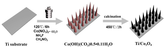 However, this method requires a longer reaction time and is not sufficiently cost-effective. Zhao et al. proposed a more energy-efficient solution with lower consumption. Initially, 5 mmol of Co(NO3)2·6H2O, 10.0 mmol of urea, and 5.0 mmol of NH4F were dissolved thoroughly into 40 mL of high-purity water at room temperature to form a homogeneous pink solution. The solution was transferred to a 60 mL, Teflon-lined stainless-steel autoclave, a Ti substrate was inserted as prepared, and the solution was held at 120 °C for 6 h. Subsequently, the Ti substrate having a pink precursor was naturally cooled to ambient temperature and cleaned with deionized water and vacuum dried, followed by annealing at 450 °C for 2 h at 2 °C/min to obtain a Co3O4 nanowire array on the Ti substrate. Nanorods of Co3O4 were obtained using this method [61] (see Figure 1).