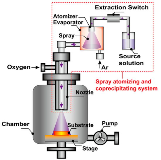 Davide Barreca et al. deposited the film in a low-pressure chemical vapor deposition (CVD) reactor with a heated susceptor. O2 is used as a carrier and a reactive gas in the process of synthesizing the oxide and removing the organic ligands as oxidation by-products. The precursor is placed in a vaporizer attached to the tube of the reactor and kept at 90 °C for the entire duration of the film deposition. The gas pipe and the valve between the bubble and the reaction tube are heated to prevent the precursor from condensing. The pressure is measured with a capacitive pressure gauge, and a mass flow controller is used to control the gas flow. Before CVD, the substrates were desorbed in soapy water, washed with water and isopropanol, and then air-dried. In order to minimize carbon contamination, their surfaces were heated by O2 flow in the reaction chamber for 40 min [33]. Chen et al. show the schematic of the direct liquid injection chemical vapor deposition (DLI-CVD) apparatus. A novel spray atomizing and co-precipitating precursor delivery system was developed; this consisted of a liquid precursor tank, the extraction switch, an atomizer, an evaporator, and some necessary stainless-steel connection tubes. Solid Co(dpm)3 (DPM; dipivaloylmethanate; Wuhan CVD Science & Technology Co., Ltd., Wuhan, China) was used as the precursor into tetrahydrofuran [63] (see Figure 2).