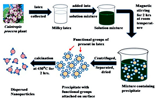 At present, the green synthesis of metal-oxide NPs is one of the most promising fields in green chemistry and nanotechnology. The method of preparing Co3O4 nanoparticles from latex at room temperature was studied. In addition, it is unnecessary to apply large quantities of heat, power [64], pressure, or poisonous substances [65,66]. Because of its environmental friendliness, simplicity, rapidity, toxicity, and economy, green synthesis offers a one-step method to synthesize Co3O4 NPs [67,68]. The Co3O4 NPs are stabilized by combining them with the biological material of amino acids, saponins, enzymes, proteins, steroids, phenol, tannin, vitamins, sugars, flavone, etc. [69,70] (see Figure 3).