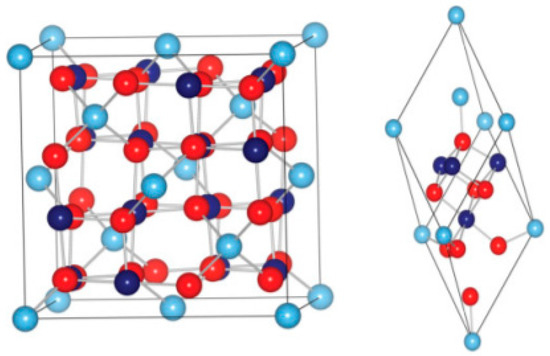 Crystal structure of Co3O4. Unit cell (left) and primitive cell (right) of Co3O4. Light cyan and navy blue balls indicate Co2+ and Co3+ ions; red balls indicate O2−ions.