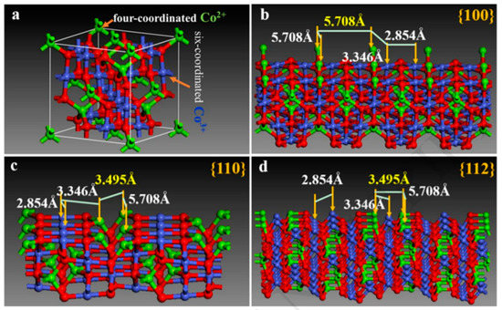 Zhou et al. studied the structure and the action mechanism of Co3O4 from the crystal structure and the atomic structure of the crystal surface. Figure 5a is a cell type (cell) structure with a pointed crystal. In Figure 5b–d, the topmost surface atoms and the first atoms, as well as the topmost suspended bonds, are exposed to the environment, and they can react oxidatively in water. Therefore, the main influential factor for the water-oxidizing activity of various well-defined Co3O4 crystals lies in the composition of the surface atoms and their respective catalytic active sites [77].
