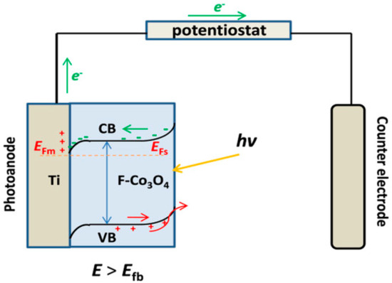 In the PC process, there is a problem with catalyst recycling. Nevertheless, in the photoelectrocatalysis process, the catalytic material is fixed on the surface of the carrier and used as an electrode, which is beneficial to the recycling of the material. In preparing the anodes, it is necessary to have a conductive substrate on which Co3O4 is deposited. Titanium plates, anodized TiO2, and fluoro-doped substrates have been used. Wang and co-workers doped F− into Co3O4 as the conducting substrate. A titanium plate was formed by etching, and cobalt nitrate was made from cobalt. Co3O4 nanowires have been prepared using the hydrothermal method and the calcining method on the titanium substrate. The best degradation conditions were obtained by varying the water temperature and electric current during the decomposition [89]. Co3O4 is unsuitable as the photoanode material to degrade organic pollutants because conventional Co3O4 is a p-type semiconductor. It is well-known that the introduction of F− can not only promote the morphology of the oxides but can also convert the intrinsic semiconductor to the n-type (e.g., SnO2) [90,91,92]. Moreover, the presence of F− in the crystal plays a key role in reducing the enucleation rate and activating the substrate, which leads to strong mechanical adhesion between the nano-architecture and the substrate. Based on the above results, the possible PEC processes were described as follows (see Figure 7): Firstly, the electrons (e−) in the valence band of Co3O4 under light irradiation could be excited to the conduction band, leaving the holes (h+) in the valence band of Co3O4. When applying an anodic bias potential to the semiconductor (i.e., the applied potential is greater than the flat band potential), there will be an increase in band bending. Thus, electrons in the conduction band are flown through the counter electrode via the external circuit, and the holes are transferred to the surface. Thus, the bands are bent downwards, producing an ohmic contact. The band-bending causes no impediment to the motion of the induced electrons from the conduction band of Co3O4 into the metal Ti. Then, the electrons are moved to the external circuit faster via an electric field, and the induced charge carriers were effectively separated.