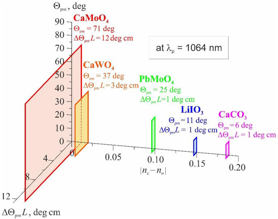 Figure 1 demonstrates an overview diagram of the phase-matching characteristics (Θpm and ΔΘpm) of parametric Raman anti-Stokes generation under pumping at λp = 1064 nm calculated from these expressions for several uniaxial Raman-active crystals depending on their birefringence |ne − no|. The refractive index data for CaCO3 (νR = 1086 cm−1, |ne − no| = 0.163), LiIO3 (νR = 770 cm−1, |ne − no| = 0.14), PbMoO4 (νR = 870 cm−1, |ne − no| = 0.10), CaWO4 (νR = 911 cm−1, |ne − no| = 0.015), and CaMoO4 (νR = 879 cm−1, |ne − no| = 0.0066) were taken from [26].
