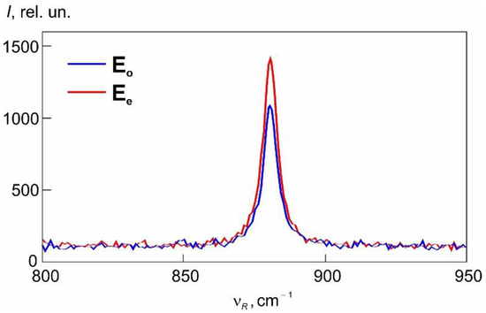 Figure 2 shows the measurement results of polarized Raman spectra for the prepared CaMoO4 crystal oriented at the phase-matching angle of Θpm = 71°. The sample was excited by continuous-wave laser radiation with a wavelength of 532 nm and an average power of 70 mW. The radiation scattered by the sample was collected according to a 180° scheme (“back-scattering”) and decomposed into a spectrum using a double monochromator “SPEX-Ramalog 1403”. The hardware resolution and sampling of the spectrum during registration were 1 cm−1.