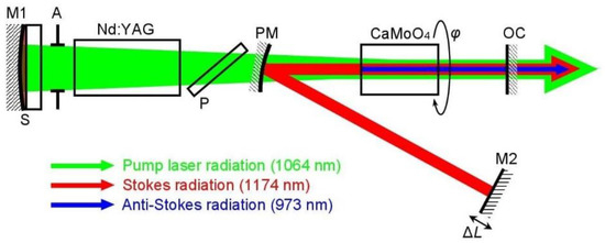 SRS conversion into the Stokes radiation (λS = 1174 nm) in the parametric Raman laser was obtained at the synchronization of pumping by detuning the parametric Raman laser cavity length, ΔL. The sensitivity of the synchronously-pumped SRS to the ΔL detuning had a scale of 10 mm. Blocking the M2 mirror (Figure 3) led to stopping SRS, which confirms the participation of the parametric Raman laser cavity in SRS conversion. The adjustment of the rotation angle (φ) of the active CaMoO4 element also provided parametric Raman conversion into the anti-Stokes radiation.