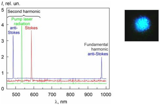 Figure 4 shows the spectra of three output radiation components decomposed by a diffraction grating after frequency doubling by a lithium iodate crystal. Frequency doubling was used to visualize the output radiation components: the pump laser radiation was green (532 nm), the Stokes radiation was yellow (587 nm), and the anti-Stokes radiation was blue (486.5 nm). It also made it possible to use a spectrometer for visible radiation, OceanOpticsHR2000 (200–1000 nm), which has a high resolution (0.4 nm). However, the width of the spectral lines of the generated radiation components did not exceed the resolution of the spectrometer. The spectral line of anti-Stokes radiation was recorded not only in the second harmonic generation (486.5 nm), but also directly in the fundamental harmonic generation (973 nm). Figure 4 also demonstrates that the anti-Stokes beam spot has a beam profile close to Gaussian with a high beam quality.