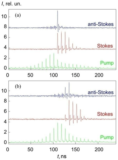 It can be seen from Figure 5a that the value of φ = 27° provided a high-quality self-separation of the single ultrashort anti-Stokes pulse from the output radiation pulse train. A similar pattern of the generation of a single anti-Stokes pulse was also obtained at φ < 27°, but with a lower anti-Stokes pulse energy. At φ > 27°, the quality of the self-separation of a single anti-Stokes pulse was sharply reduced. Figure 5b demonstrates such a situation at φ = 32°. It should be noted that, in this case, the pulse train of the Stokes radiation shifted to the rear of the pulse train of the pump laser radiation with a decrease in the SRS oscillation efficiency. A similar temporal pattern (as in Figure 6b) of the degraded generation of both Stokes and anti-Stokes radiation was also observed at |ΔL| > 5 mm even in the case of φ ≤ 27°.