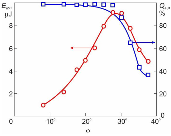 It can be seen from Figure 6 that the anti-Stokes pulse train energy had a maximum of Emax = 9 μJ at φopt = 27°–30°. It can also be seen that, at φ < 30°, a high-quality self-separation of a single ultrashort pulse of the anti-Stokes radiation with QaS > 90% was achieved. At φ > 30°, the QaS value decreased sharply because the train of several (two and three) anti-Stokes pulses was generated, but the anti-Stokes pulse train energy decreased.