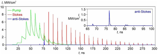 Figure 7 demonstrates the simulation result of the laser oscillation at Rp = RS = 95%, RS2 = 100%, RaS2 = 0%, La = 10 см, Lb = 3 см, ka = kb = 0.01 см−1, Tfa = Tfb = 99.5%, Lfree = 107 см, ΔL = 0, TQ0 = 40%, TQ1 = 85%, φ = 27°, and ra/rb = 2.2. The angle φ was chosen at an optimal value (27°), providing the highest intensity of anti-Stokes generation. It can be seen that, in the Q-switching regime, the output giant pulse of the pump laser radiation (green line) has a modulation with a period equal to a round-trip time of the pump laser cavity tcav = Lcav /c = 8.7 ns (Lcav = Lfree + La∙na + Lb∙nb = 131 cm is the optical length of the pump laser cavity). In this case, the output Stokes (red line) and anti-Stokes (blue line) radiation of the parametric Raman laser oscillates in the form of trains of ultrashort radiation pulses with a repetition period equal to tcav. It should be noted that the ra/rb ratio was increased up to a value of 2.2 to increase the SRS conversion efficiency, which provides the shortening of the anti-Stokes pulse train to a duration close to tcav for the self-separation of only one intense anti-Stokes pulse in the anti-Stokes pulse train. However, the quality of this self-separation is not very high.