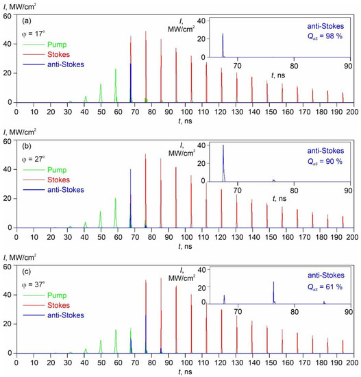 It can be seen from Figure 8 that the use of the rapidly acting shutter led to the generation of an intense ultrashort pulse train of the pump laser radiation (green line), which is similar in result to the mode-locking regime. Despite the small value of ra/rb, we can also see the efficient SRS oscillation of a train of ultrashort Stokes pulses (red line), which ensures the generation of a single intense ultrashort anti-Stokes pulse (blue line). The radiation pulses turned out to be significantly shorter and more intense than in the previous case. However, it should be noted that we used a single-mode model, so the duration of ultrashort pulses here depends on the inertia of the shutter (the topen duration), but when the laser cavity modes are locked, the pulse duration should be determined by the number of locked modes. Consequently, our single-mode model does not provide correct information about the duration of the ultrashort radiation pulses, but adequately describes the mechanism for the self-separation of a single intense ultrashort anti-Stokes pulse by energy density. Thus, at φ = 17° (Figure 8a), a part of energy density in the output anti-Stokes radiation is low and amounts to EaS = 0.4% of the active Nd:YAG element-stored energy density (=αth La ћωp/σem), but the self-separation quality of a single anti-Stokes pulse is very high (QaS = 98%). At the optimum value of φ = 27° (Figure 8b), the energy density part in the anti-Stokes radiation reaches its maximum value and amounts to EaS = 1% of the active Nd:YAG element-stored energy density. The self-separation quality is still high (QaS = 90%). At the higher angle of φ = 37° (Figure 8c), the anti-Stokes energy density part and self-separation quality decrease to EaS = 0.5% and QaS = 61%, respectively. The fully calculated dependences of EaS and QaS on φ are shown by lines in Figure 6, where we can see a good agreement with the experimental points.