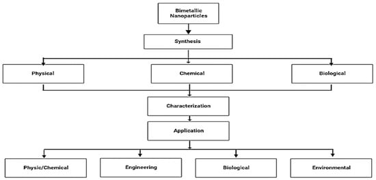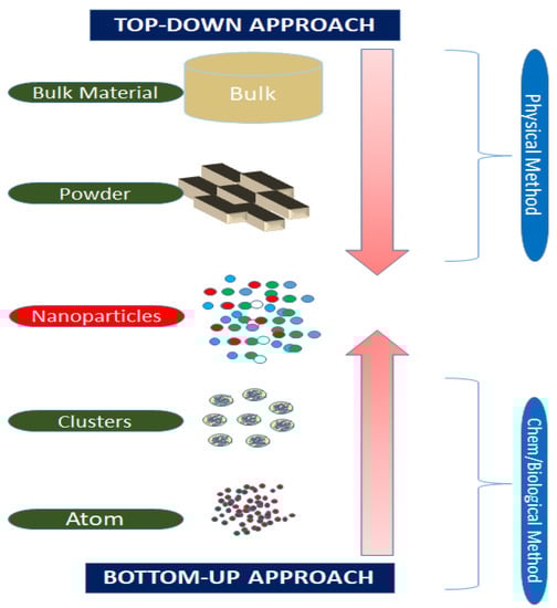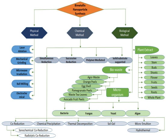 There are three methods of synthesizing nanoparticles: physical, chemical and biological (Figure 1). Either of the two main approaches can make these methods, namely, the top-down and the bottom-up approach. The top-down approach involves the breaking down of the bulk material by external mechanical force to nanosized particles, e.g., mechanical grinding, ball milling, laser ablation, microwave irradiation, etc. On the other hand, the bottom-up approach involves building the nanoparticles right from the atomic level. Atoms build up to form molecules, then the molecules grow into a cluster and finally create the nanoscale particles. Examples of this method include the sol-gel process, pyrolysis and chemical precipitation [27]. Though the top-down approach is a faster method, there is no control of particle shape and size as compared to the bottom-up approach, where shape and size can be easily controlled by controlling the synthesis parameters such as pH, temperature and concentration. This review will focus on bimetallic nanoparticles, synthesis, characterization, biological and environmental applications and the toxicity of bimetallic nanoparticles.