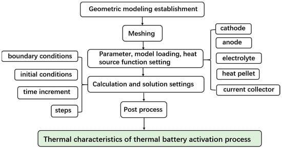 The flow chart of this work is shown in Figure 1. The simulation was performed using COMSOL Multiphysics 6.0 software, in which the solid heat transfer module solves the solid heat transfer problem in thermal battery simulation. The simulation of thermal batteries can be divided into four steps, including meshing, calculation and solution settings, and postprocess. The temperature system considered in this work is based on degrees Celsius.