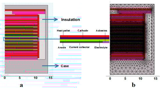 (a) Thermal battery model and (b) the corresponding meshing diagram.