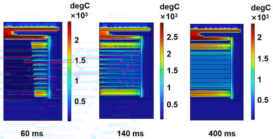 To visually illustrate the internal temperature change of the thermal battery during activation, the temperature clouds of 60 ms, 140 ms, and 400 ms are selected, as shown in Figure 4. The upper and lower parts of the stack have a higher temperature due to the large number of heating plates, which can also better maintain the temperature of the thermal battery. At 60 ms, the heating plate is in an unburned state with the temperature of the burned area gradually rising. At 140 ms, the heating plates are all burned out and the heat is transferred inside the thermal cell; At 400 ms, the internal temperature of the stack tends to be stable. Then, the temperature is maintained at about 525 °C. In this situation, the thermal battery model is equipped with an asbestos insulation layer and the temperature of the stack drops slowly.