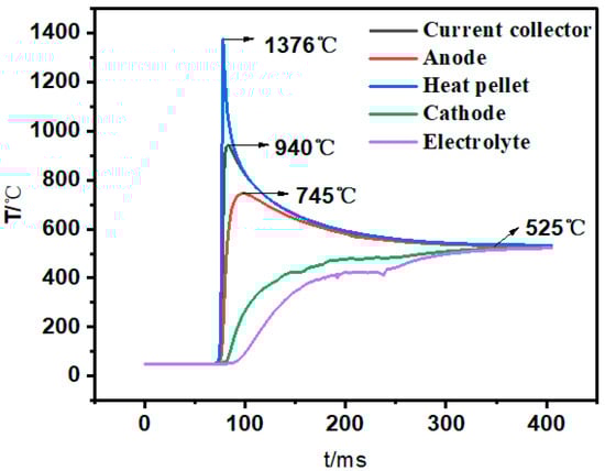 As shown in Figure 5, the temperature change of the single cell (the fourth cell from top to bottom) is monitored during the activation process. The heat of the heating plate is transferred from the ignition strip to the components of the thermal battery within 400 ms. At 400 ms, the temperature tends to be consistent and is maintained at 525 °C, which is consistent with the temperature cloud result. The highest temperature of the heater pellets and the current collectors reach 1376 °C and 940 °C, respectively. The anode needs to withstand a thermal shock of 700 °C, but it does not reach the melting temperature of the LiSi alloy. The highest temperature of the cathode is 525 °C. The temperature curves of the cathode and the electrolyte sheet fluctuate slightly during the heating process, showing that a certain proportion of the electrolyte phase change material is added to the cathode, and a part of the heat is absorbed during the electrolyte melting process. Due to the working mechanism and fast-activation requirements of thermal batteries, the temperature of electrolytes rises faster than the as reported Li-ion battery electrolytes [,]. Based on it, the curves have a small fluctuation, which is in line with the actual situation.