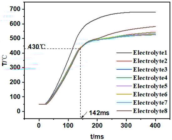 The average temperature rising curves of electrolytes are shown in Figure 6. Electrolyte 1 and electrolyte 8 represents the electrolyte in the single cell at the top and bottom of the stack, respectively, beside which additional heating plates are located. As a result, the temperature curves of electrolytes 1 and 8 have a faster temperature increase compared with other curves. The average temperature of all electrolytes exceeds the melting point of 430 °C at 142 ms.