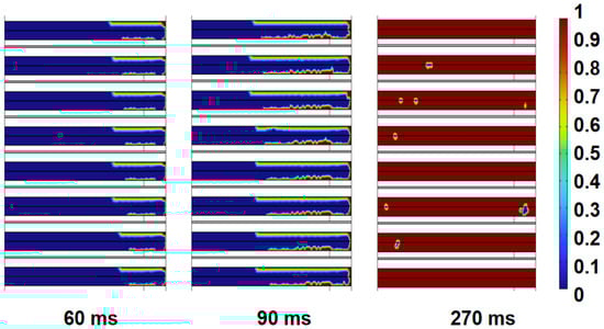 In order to predict the activation time more accurately with the small-size thermal battery model, the phase-change domain is set in the electrolyte and cathode regions with the activation time predicted by the electrolyte melting situation. The phase change cloud of the thermal battery is shown in Figure 7, in which red regions indicate complete electrolyte melting while blue ones indicate unmelted. Due to the exothermic order of the heat pellet, the upper electrolyte sheet melts prior to the lower electrolyte sheet. The melting area spreads from the right to the left with all electrolytes beginning to melt at 90 ms until 270 ms. According to the analysis above, the temperature of the collector sheet and the anode in the single battery rises rapidly. The phase change cloud diagram of the thermal battery and the temperature map of the monomer can verify each other, indicating that the main heat flows into the electrolyte region from the anode. It can be seen from the literature [,] that the cathode material has a lower thermal diffusivity, and the heat is hard to enter the electrolyte from the cathode side, so the development of a higher thermal conductivity electrode material can reduce the activation time. It is believed that when all electrolytes begin to melt and connect the cathode and anode, the thermal battery is in an active state with an on-load capacity. Based on it, the electrolyte melting time at 50 °C t2 = 90 ms. Combined with the mechanical activation ignition time, the forecast for activation is 91.2 ms, which is consistent with the widely known experimental activation time of below 200 ms for thermal batteries.