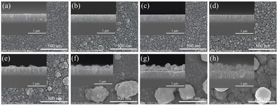 FE-SEM images of the surface and thickness of Cu2O thin films grown at various substrate temperatures: (a) 25 °C, (b) 100 °C, (c) 150 °C, (d) 200 °C, (e) 250 °C, (f) 300 °C, (g) 350 °C, and (h) 400 °C.