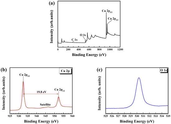 XPS spectra of a Cu2O thin film grown at a substrate temperature of 400 °C; (a) all surveyed spectra, (b) Cu 2p, and (c) O 1s peaks.