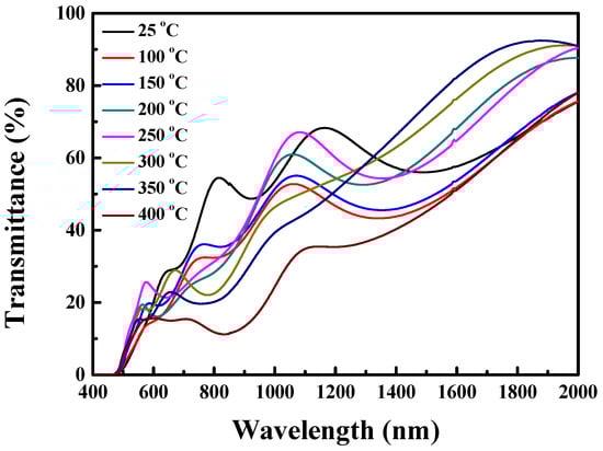 Figure 4 shows the light transmittance spectra of the Cu2O films prepared at substrate temperatures from 25 °C to 400 °C, and the measurements were performed in a wavelength range from 400 to 2000 nm. The transmittance values in specific regions (visible and near-infrared rays) can be found in Table 3, along with the average transmittance values of the Cu2O films. The average transmittance of the Cu2O thin film deposited at a substrate temperature of 25 °C was 50.2%, and as the temperature increased, the transmittance of the film decreased to 34.3% at 400 °C. The reduction in the transmittance was closely related to the size and shape of the grains forming the fine surface of the film. As observed in the FE-SEM surface morphology in Figure 2, the grain size of the Cu2O thin film deposited via sputtering significantly increased as the substrate temperature increased. This increase in grain size created more crystallographic boundaries within the film. More crystallographic boundaries cause further scattering and absorption of light within a Cu2O thin film, thus reducing the average transmittance of the film [37,51,52]. Therefore, as the substrate temperature increases, the optical properties of the film change due to the increased crystallographic boundary, resulting in a decrease in the average transmittance. In the visible region (λ = 400 to 750 nm), the transmittance was decreased from 15.9% (25 °C) to 10.1% (400 °C). In the near-infrared region (λ = 750 to 2000 nm), the transmittance was also reduced from 60.2% (25 °C) to 41.7% (400 °C) as the substrate temperature was increased.