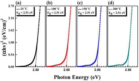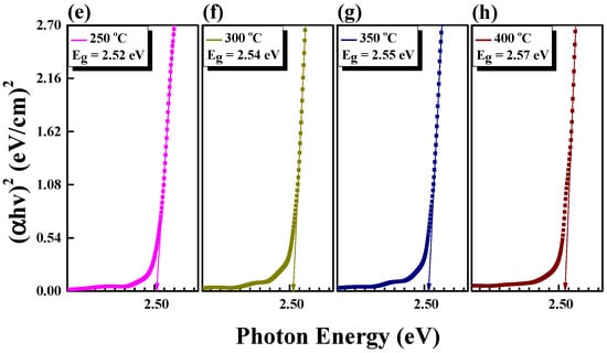 Figure 5 shows the band gaps of the Cu2O films based on the Tauc plot. The Eg was constant from 25 °C to 200 °C. When the substrate temperature was increased in steps from 250 °C to 350 °C in 50 °C increments, the value of Eg slightly increased. The highest Eg value of 2.57 eV was measured at a substrate temperature of 400 °C. These results matched well with the previously reported Cu2O band gap energy values (2.1 to 2.6 eV) [55,56]. The energy band gap of the Cu2O thin films deposited via sputtering could increase with increasing substrate temperature due to changes in the microstructure and chemical composition of the thin films. Films grown at relatively low substrate temperatures were typically amorphous or contained small crystallites. Conversely, as the substrate temperature increased, the crystallites became larger, and the crystallinity of the film improved. This can be explained by the Burstein–Moss effect (blue shift), which refers to the expansion of the energy band gap by changing the electronic band structure of a film [57,58].