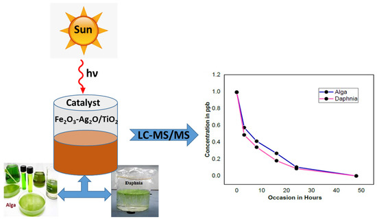 Ahmed, F.; Rao, T.N.; Arshi, N.; Prashanthi, Y.; Kumar, S.; Alshoaibi, A. Fe2O3-Ag2O/TiO2 Nanocatalyst-Assisted LC-MS/MS-Based Detoxification of Pesticide Residues in Daphnia magna and Algae Mediums. Crystals 2023, 13, 644. https://doi.org/10.3390/cryst13040644
