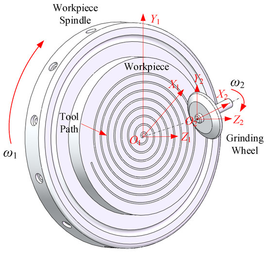 In parallel grinding, a diamond grinding wheel with a circular arc on the cutting edge profile is mostly adopted. The cutting direction of the grinding wheel is tangentially parallel to the rotation direction of the workpiece, but the direction of their linear velocities are opposite to each other (reverse grinding). Figure 1 is a typical schematic diagram of parallel grinding. When the wheel rotates, it moves toward the center of the workpiece at a constant feed rate. Since the rotation speed and feed rate of the workpiece remain constant, the distance the grinding wheel moves toward the center of the workpiece is constant for each cycle the workpiece rotates; thus the tool path of parallel grinding on the workpiece surface is a spiral. In the grinding process, the linear velocity of the workpiece is different at different cutting points of the grinding wheel, and the volume of the material removed when the grinding wheel completes one circle is proportional to the radial position of the grinding point on the workpiece surface. Therefore, the relative motion error of the grinding wheel, geometrical shape of the grinding wheel, and machining parameters will have an important influence on the ground surface topography generation. In ultra-precision parallel grinding, the workpiece spindle is vertical to the grinding wheel spindle, and the wheel performs a linear feed motion from the edge of the workpiece to the rotating center along a spiral path to realize the material removal process, as shown in Figure 1.