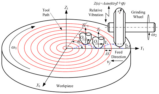 In grinding, the relative motion of the wheel is the result of the superposition of the motion of each axis, which transfers characteristics of the wheel cutting profile to the part surface and determines the final machined surface generation. Therefore, the geometric modeling of surface topography generation can be calculated according to the motion process of each axis. Figure 2 schematically shows the motions of the wheel and workpiece in ultra-precision parallel grinding, which include the rotation of the workpiece and grinding wheel as well as the linear movement of the machine table along the feed direction (x axis). However, the vibration with the same frequency as the wheel rotation is the dominant mode of tool vibration, which is responsible for the ground surface profile variation and degrades the surface quality.