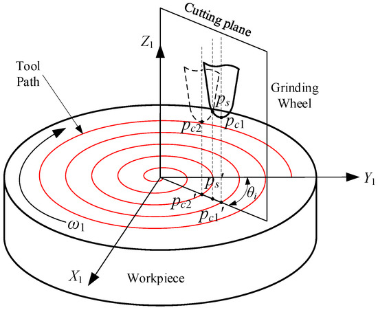 According to the geometric relation of the relative motion of the grinding wheel with respect to the workpiece, the coordinates of the circular arc contour of the grinding wheel in each radial position of the workpiece and the intersection point of the adjacent circular arc contour were obtained, with which the residual surface profile can be calculated to reconstruct the finished surface. The coordinate system X1-Y1-Z1 was employed to calculate the workpiece surface profile generation. The discrete workpiece surface can be established in the radical and circumferential directions, in which it is divided into a certain number of segments along the circumferential and radical directions of the workpiece with an equal angle interval () and tool path interval (), respectively. The number of cutting positions on the workpiece surface can be expressed as: