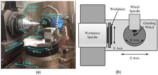 The experiments were performed on a four-axis grinding machine (Moore Nanotech 450UPL). The ultra-precision grinding machine consists of two linear guides (x axis and z axis) and two rotation spindles (workpiece spindle and wheel spindle), as shown in Figure 4. The samples were mounted on an aluminum fixture, which was placed on the vacuum chuck of the workpiece spindle. Before grinding, dynamic balancing of the two spindles was carried out to make the radial runout less than 10 nm. In order to obtain the amplitude of the wheel vibration, a laser displacement sensor with high resolution was employed. A resin-bonded diamond grinding wheel was selected with a 1500# mesh size. The parallel grinding tests were performed on reaction-sintered SiC to investigate surface generation and verify the ground surface model. Before the test, all the samples were ground to obtain a relatively flat surface to reduce the effect of tool wear, and we then preformed the wheel dressing operation before each experiment. A Taylor Hobson roughness profiler (Form TalySurf PGI 1240; measuring error: 0.8 nm vertical resolution) was used to measure the machined surface after the tests.