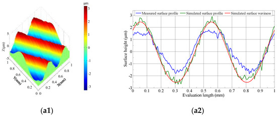Simulated surface and measured surface under out-of-phase shift (phase = 0): (a1) simulated surface topography; (a2) surface profile height.