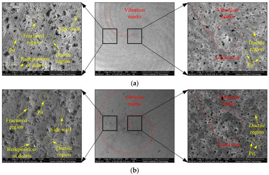 The machined surface images of the samples under different phase conditions (out of phase and in phase) are shown in Figure 7. It can be clearly observed that a spiral mark formed on the ground surface, and the mark period changed with the phase shift development which is caused by the vibration of the grinding wheel. In the central area, the vibration mark evolved into a straight-line mode, which acted along the tangent orientation of a circular section (uncut area). The straight-line pattern for the vibration marks were attributed to the gradually decreasing linear velocity when the cutting point between the tool and workpiece moved from the outer regime to the centers of the rotation for the part spindle. We found a more ductile area for the ground surface generation in the center area in comparison with the edge regime for parallel grinding of SiC. This shows a higher grinding ductility in the center area, which is caused by the gradually decreasing chip size under constant decreasing liner cutting speed. Furthermore, the ground surface condition improved with the appearance of the phase shift both for the edge and center regions, in which a less fractured area was formed due to smaller chips generated by a higher degree of wheel cutter trajectory interference, as shown in Figure 7a,b. This shows that the phase shift is an important factor both for the evolution of vibration marks and grinding ductility. The main reason for this is the increase in interference on adjacent cutting paths under in-phase shift conditions, which results in the decrease in surface residual height. This indicates that the radial interference of adjacent grinding paths has a significant effect on the machined surface quality and cannot be ignored. The phase shift alters the relative grinding wheel position between neighboring tool paths with respect to the workpiece, which directly influences the relative depth of cut for abrasive grains distributed on the wheel and in turn effects the ductility for material removal. The phase shift effect can enhance the interference of adjacent abrasive grains’ cutting paths and help to reduce the surface residual height, which can significantly improve the surface quality of grinding.