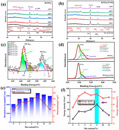 GIXRD spectra at different annealing temperatures: (a) BT films; (b) BT-8%Mn films; (c) Mn 2p XPS spectrum in BT-8% Mn films; (d) XPS spectrum of O 1s in BT and BT-8%Mn films; (e) polarization and breakdown strength of BT-x %Mn films; (f) energy storage performance of BT-x %Mn films.