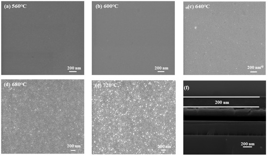 Figure 2 shows the SEM images of BT-8%Mn films annealed at different temperatures. It can be observed that the film surface is smooth and flat with only a very small number of grains at low annealing temperatures (560 °C, 600 °C). As the annealing temperature increases to 640 °C, an increase in the number and size of grains can be clearly observed. When the annealing temperature reaches 720 °C, there are almost crystallized grains in the film. This is because higher temperatures are beneficial for crystalline nucleation. As the annealing temperature increases, the film shows a reduction in the amorphous phase and an increase in the crystalline phase; this is consistent with the results in the GIXRD diagrams. Figure 2f shows the fracture of the BT-8% Mn film annealed at 640 °C with a thickness of approximately 200 nm.