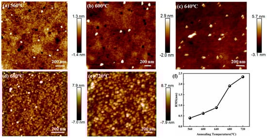 AFM images of BT-8%Mn films annealed at different temperatures: (a) 560 °C; (b) 600 °C; (c) 640 °C; (d) 680 °C; (e) 720 °C; (f) variation of RMS with annealing temperature.