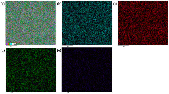 Figure 4 shows the EDS (Energy Dispersive Spectrometer) spectrum of BT-8% Mn film, where Figure 4a is the total spectrum of all elements and the rest is the single element spectrum of the Ba, Ti, O, and Mn elements. It can be seen from the figure that the distribution of each element covers the entire film evenly and that there is no agglomeration. This also reflects the good film preparation process, and the sol-gel method makes it easy to prepare a film with uniform distribution and good quality.