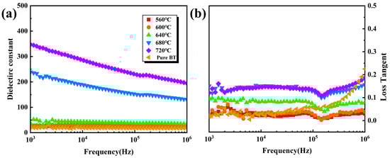 Figure 5 shows the change in dielectric constant and dielectric loss for films at 103 Hz–106 Hz with different annealing temperatures. Usually, a high dielectric constant means high crystallinity [38]. The low dielectric constant at low frequencies can be attributed to the fact that the electric field changes slowly at low frequencies, and the response of the dipole polarization mechanism that affects the dielectric constant can keep up with the change in the electric field frequency, so the larger dielectric constant is highlighted. On the contrary, at higher frequencies, most dipoles cannot keep up with the change of the electric field, and the dipole orientation polarization is too late to respond, and the contribution to the dielectric constant is reduced, so the dielectric constant will become smaller [39]. At low annealing temperatures, the dielectric constant of the film is less than 50 due to the majority amorphous phase in the film. When the annealing temperature reaches 680 °C, the dielectric constant is much higher than 50, indicating almost crystalline. The trend of dielectric loss is the same as that of the dielectric constant. Both show a tendency to increase with annealing temperature, which is consistent with what is seen in the microstructure characterization.