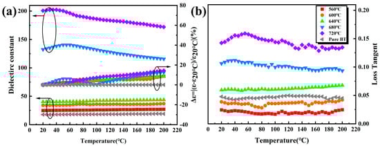 Figure 6 shows the temperature dependence of the dielectric constant and the dielectric loss of BT-8% Mn thin films at different annealing temperatures. It can be seen from Figure 6a that the dielectric constant of the film shows a slight increase with temperature at low annealing temperatures (560 °C, 600 °C, 640 °C). This may be due to the fact that as the test temperature increases, the dipole is activated by heat to respond more to the polarization process and increase the dielectric constant. At high annealing temperatures (680 °C, 720 °C), the dielectric constant first increases and then decreases with increasing temperature. The change trend of dielectric loss is basically consistent with the dielectric constant, as shown in Figure 6b. If the dielectric constant of BT-8% Mn film at 20 °C is taken as the reference, the temperature stability of the dielectric constant of the film can be expressed by the formula Δε = |ε − ε20°C/ε20°C| × 100%. The results show that the Δε of all films is less than 15% from 20 °C to 200 °C, which indicates that BT-8% Mn has good dielectric temperature stability.