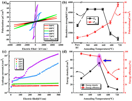 The P-E loop is an important parameter reflecting the energy storage performance of the films. Figure 7a shows the P-E loop plots of the films at different annealing temperatures. At low temperatures (560 °C, 600 °C, and 640 °C), the P-E loops are thin, indicating excellent energy storage efficiency. As the annealing temperature increases, the P-E loop becomes fatter and Pr increases, then the energy storage efficiency deteriorates sharply. The formula for energy storage density [40] shows that the values of maximum polarization (Pmax) and electric field strength (E) should be as large as possible in order to obtain a high energy storage density. Figure 7b shows the Pmax and its corresponding breakdown strength at different annealing temperatures, limited by the test instrument. The films prepared at 560 °C, 600 °C, and 640 °C did not break down, so the maximum electric field strength that can be measured was selected as the breakdown strength. At 640 °C, the film obtains a high breakdown strength and a moderate Pmax, which collectively reach the best value for the energy storage density. Figure 7c shows the I–V characteristic curves of the BT-8%Mn films with different annealing temperatures at 0–495 kV/cm electric field strength. It can be observed that the leakage current of the film at high annealing temperatures (680 °C–720 °C) is much larger than at low temperatures (560 °C–640 °C), and the current increases sharply with the increase in the electric field. The high leakage current value not only leads to the low breakdown strength of the film [41], but also causes a sharp decrease in its energy storage efficiency [42]. The trend of energy storage density and energy storage efficiency with annealing temperature is shown in Figure 7d. The highest energy storage density up to 72.4 J/cm3 is for the BT-8%Mn film annealed at 640 °C with 88.5% energy efficiency. The energy efficiency shows a decreasing trend with the increase in annealing temperature, especially after 640 °C, which has a close relationship with crystal phase increase.