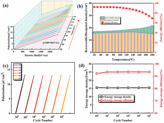 Temperature stability is an important parameter to measure the ability of film capacitors to work properly when the environment changes. Figure 8 shows the variation of the film energy storage performance with temperature (20 °C–200 °C) under an electric field of 2489.96 kV/cm. It can be observed that the polarization value increases slightly, and the energy storage efficiency decreases as the temperature increases. The energy storage density fluctuates between 15.05 J/cm3 and 16.58 J/cm3, and the change rate is about 10% as the test temperature of the film increases from 20 °C to 200 °C. Further, the energy storage efficiency decreases from 92.28% to 69.23%. The cycle stability of the film characterizes the change in performance of the film during the long-term charge and discharge process. Through this performance, it can be judged whether the film has a good working life. The cyclic stability of the film is shown in Figure 8c,d. During the charging/discharging cycles of 100–105, the polarization value, P-E loops’ shape, and energy storage performance of the films did not change significantly. This indicates that the film has excellent cycle stability. Excellent temperature and cycle stability enable the film to adapt to harsh conditions and changing environments, and it has a better application prospect.