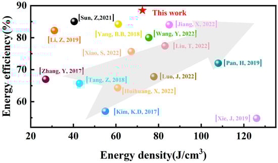 - Shi, J.; Zhao, Y.; He, J.; Li, T.; Zhu, F.; Tian, W.; Liu, X. Deferred polarization saturation boosting superior energy-storage efficiency and density simultaneously under moderate electric field in relaxor ferroelectrics. ACS Appl. Energy Mater. 2022, 5, 3436–3446. [Google Scholar] [CrossRef]