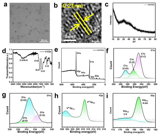(a) TEM image of V−CDs. (b) HRTEM image of V−CDs. (c) XRD pattern of V−CDs. (d) FTIR spectra of V−CDs. (e) XPS survey spectra of V−CDs. The high resolution XPS spectrum of V−CDs: (f) C1s, (g) O1s, (h) V2p, and (i) S2p, respectively.