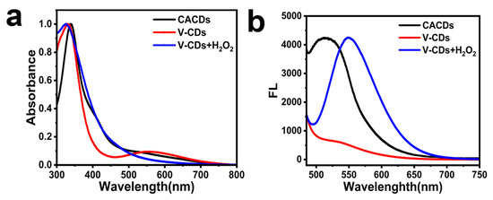 (a) UV−vis spectrum of CACDs, V−CDs, and H2O2 treated V−CDs. (b) Fluorescence spectra of CACDs, V−CDs, and H2O2 treated V−CDs at excitation wavelengths of 480 nm.