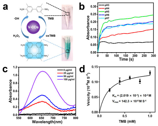 (a) Schematic illustration of TMB used to detect OH produced by V−CDs catalytic H2O2. (b) Catalytic activity of V−CDs for TMB oxidation at various pH values. (c) Absorption spectra of TMB in the presence of H2O2 at different concentrations of V−CDs. (d) Steady state kinetic assay of V−CDs catalytic activity.