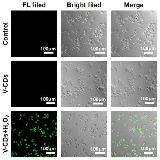 As proved in the solution, V doping could cause fluorescence quenching of V−CDs due to heavy atom effect. In the presence of H2O2, V4+ in the V−CDs can be oxidized to V5+, which releases from the V−CDs to restore the fluorescence of V−CDs. Subsequently, we evaluated the fluorescence imaging of HeLa cells treated by V−CDs under the stimulation of excessive H2O2 using CLSM. As shown in Figure 4, when there is no H2O2, no fluorescence was observed in the V−CDs-treated HeLa cells. With the addition of H2O2, the fluorescence emitted by V−CDs could be observed in HeLa cells. Under the excitation of a 488 nm laser, green emissions within the range of 510 to 540 nm could be collected and uniformly distributed in HeLa cells, indicating that V−CDs are effectively absorbed through endocytosis. All these results show that the prepared V−CDs can be used as a TME stimuli-responsive nanoprobe for in vitro biological multicolor fluorescence imaging.