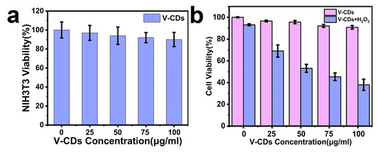 (a) The viability NIH3T3 cells incubated with various concentrations of V−CDs. (b) The viability HeLa cells incubated with various concentrations of V−CDs in the presence of H2O2.