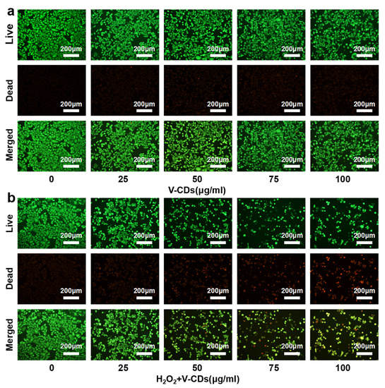 The calcein AM/PI staining experiment was carried out to further prove the specific CDT efficacy of V−CDs. As shown in Figure 6a, in the V−CDs-treated groups, only green (live) and no red (dead) fluorescence was observed, agreeing well with the low cytotoxicity of CACDs. Since only a few dead cells lost their adherent state, resulting in being washed out during the process of staining, the red fluorescence in the picture is not obvious. With the addition of H2O2, the green fluorescence gradually weakened, while the red fluorescence improved with the increase of the concentration of V−CDs (Figure 6b), verifying the excellent H2O2-activated CDT efficacy of V−CDs.